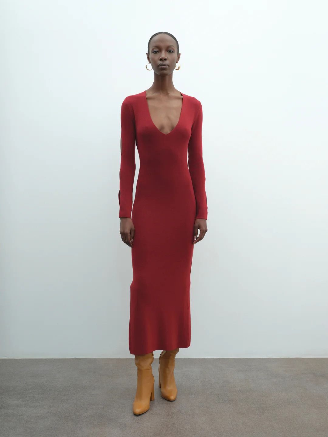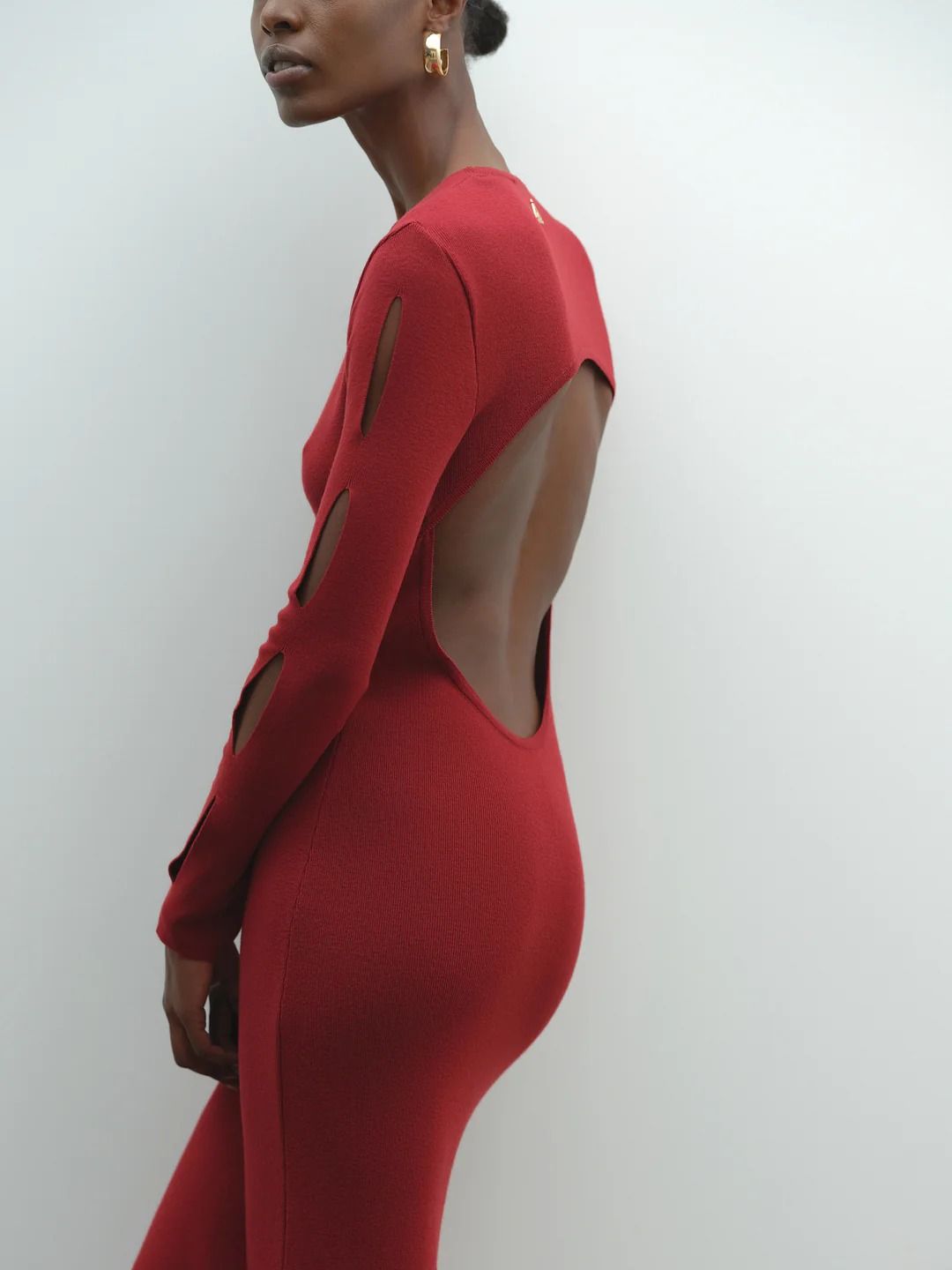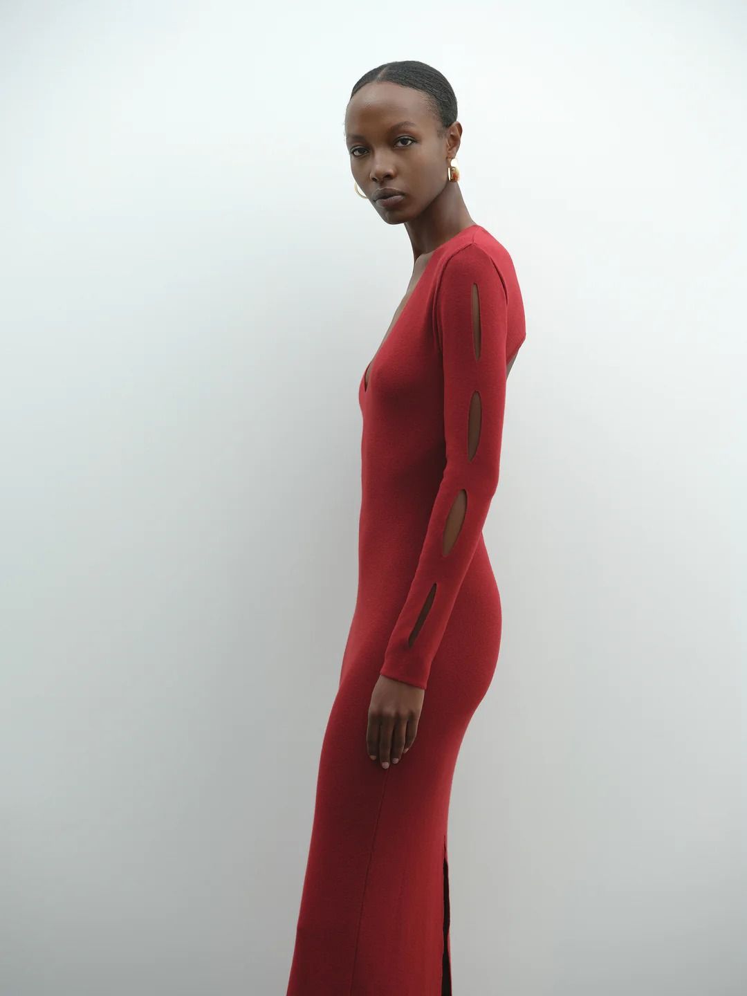 Abito lungo aderente con fori lungo le maniche, tessuto elasticizzato.