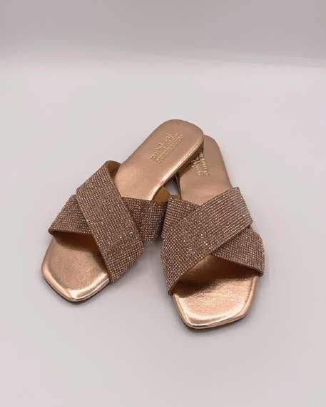 Ciabatta in cuoio incrociata con strass tono su tono, fondo laminato in tinta.