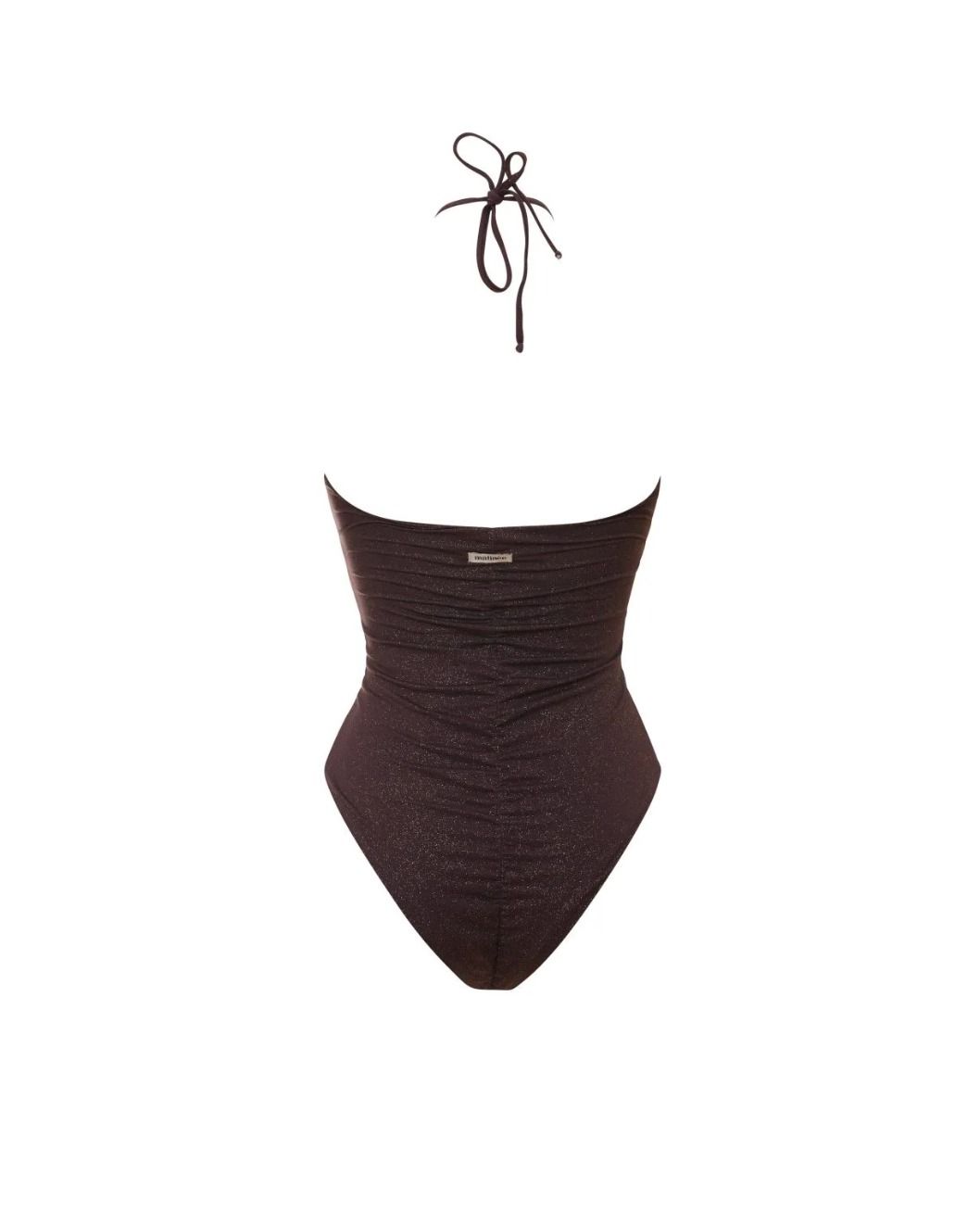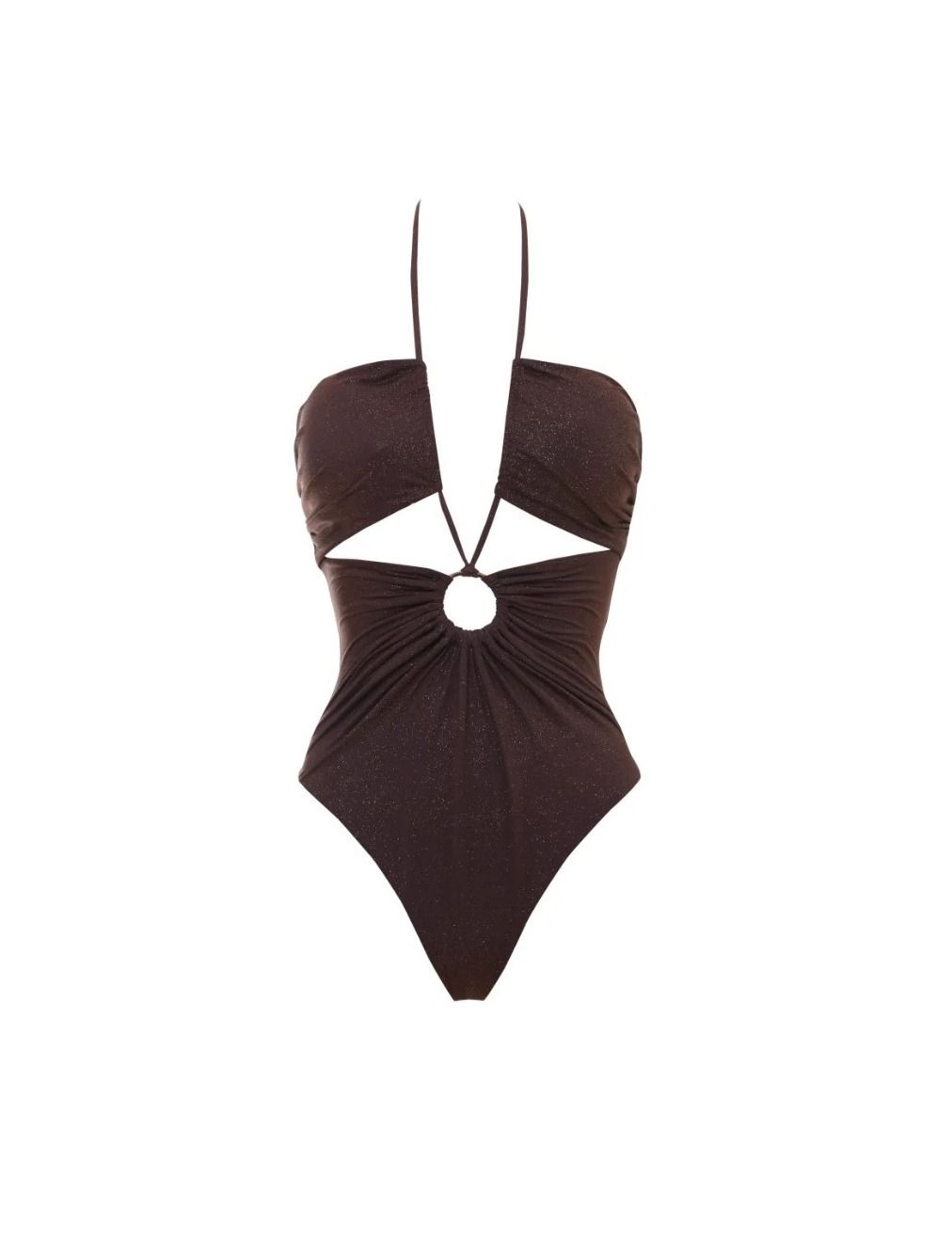 Intero con scollatura profonda e dettaglio cut out, allacciatura al collo, coppette estraibili, slip brasiliano.