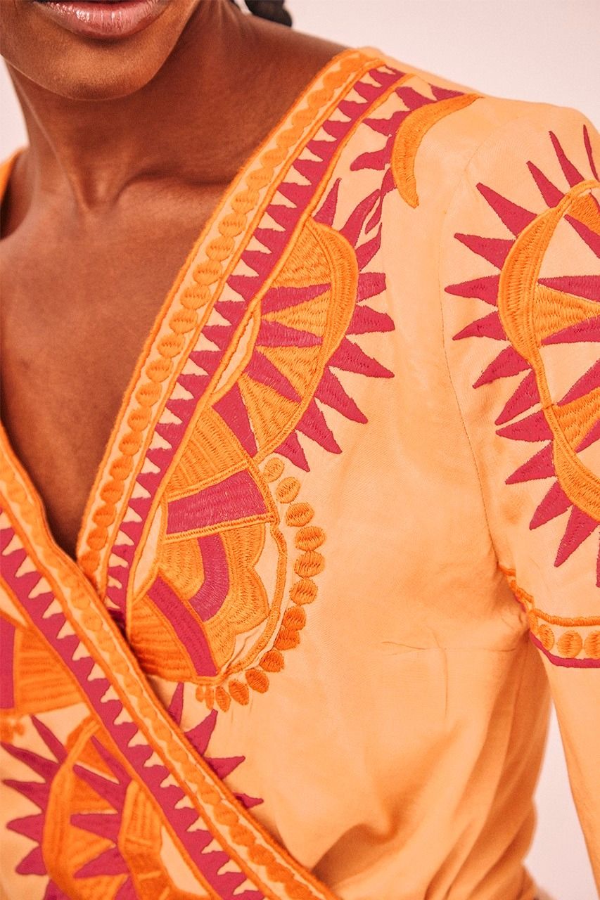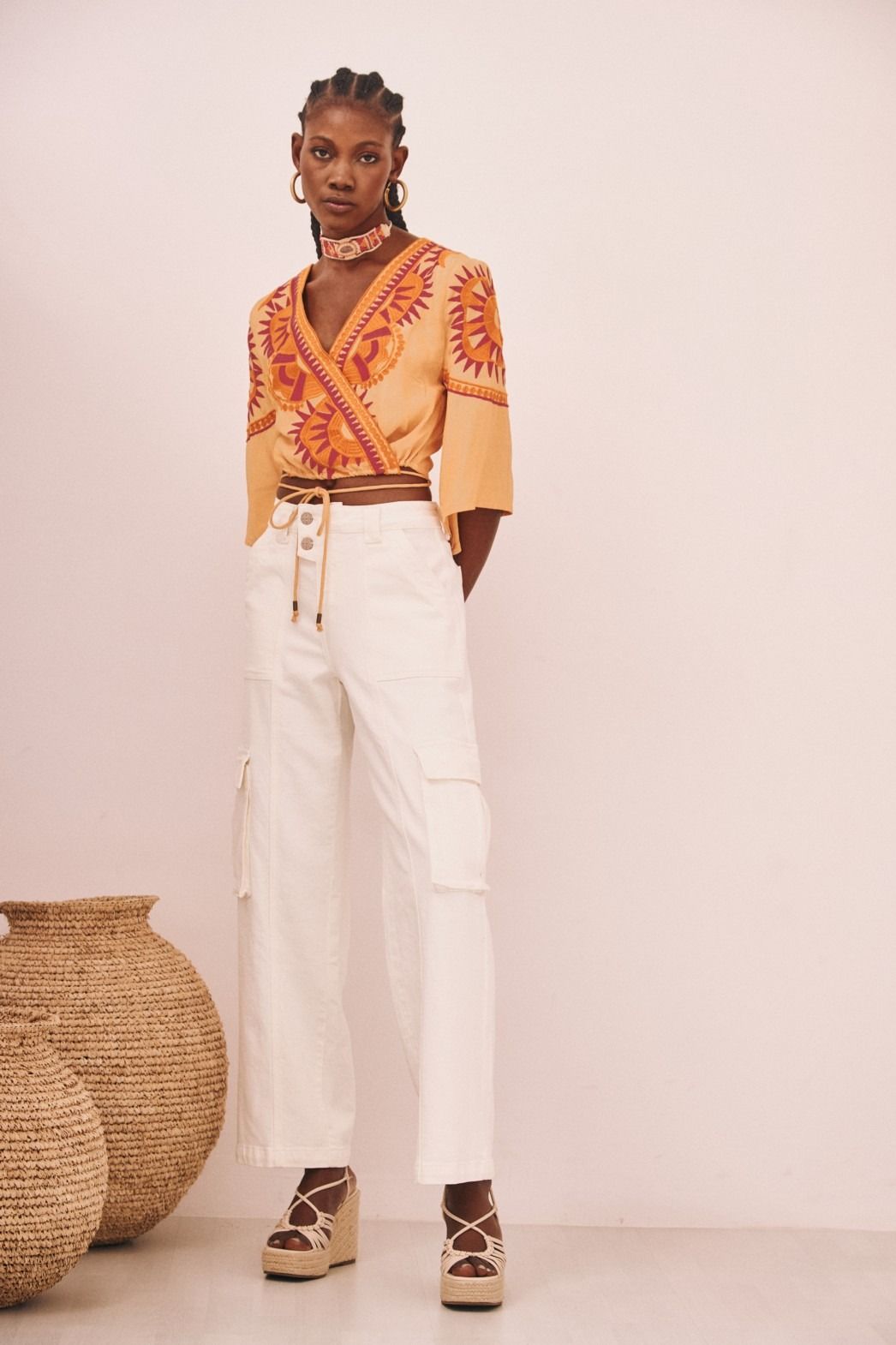 Blusa corta a maniche lunghe, con vita alta e ricami bicolore su maniche e scollo.