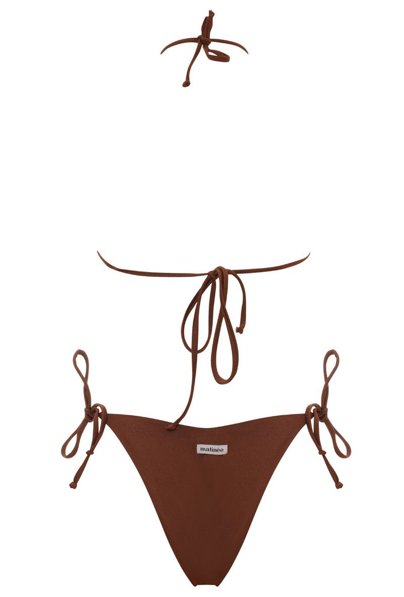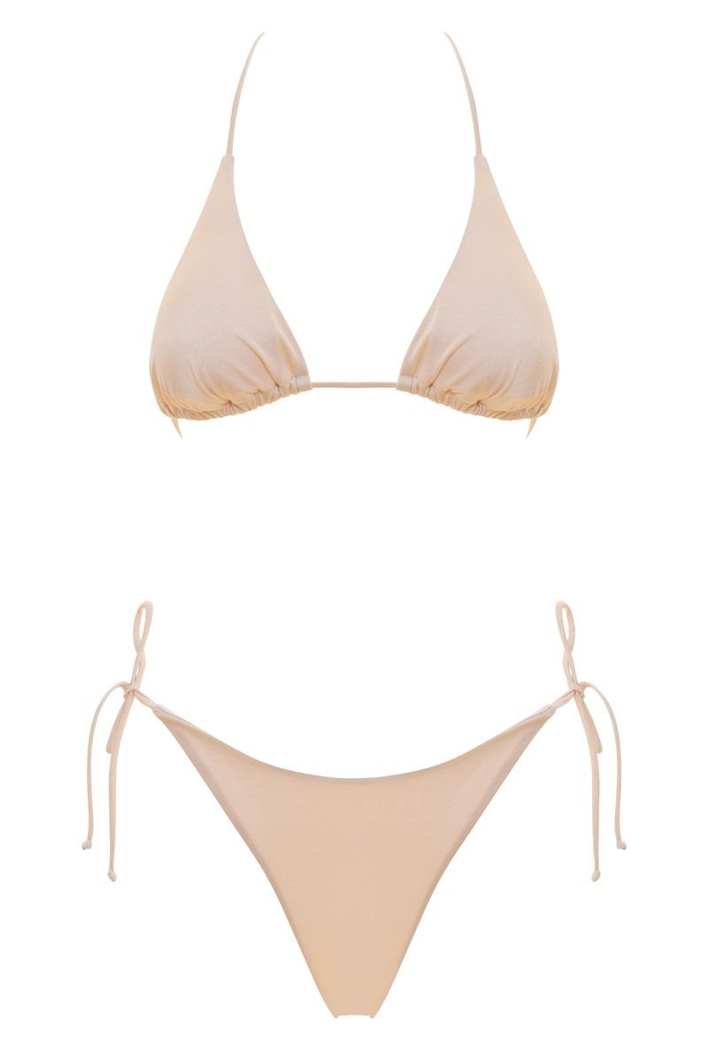 Triangolo con coppette estraibili e chiusura con laccetti, slip brasiliano con laccetti laterali.