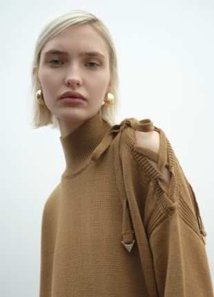 Maglione dolcevita con lacci intrecciati sulla spalla.