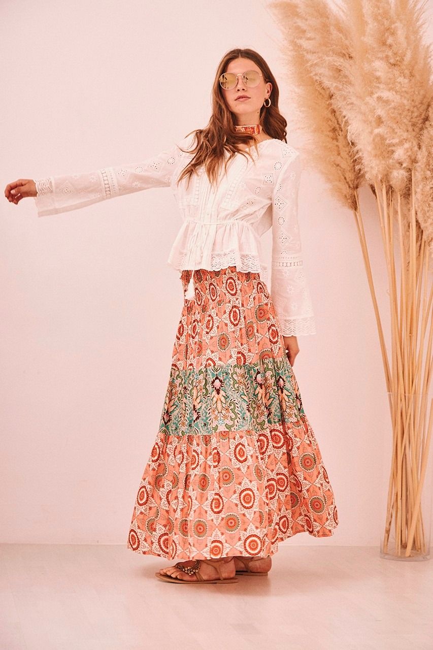 Blusa semplice con ricami, lunga fino ai fianchi, con maniche lunghe e scollo a V.