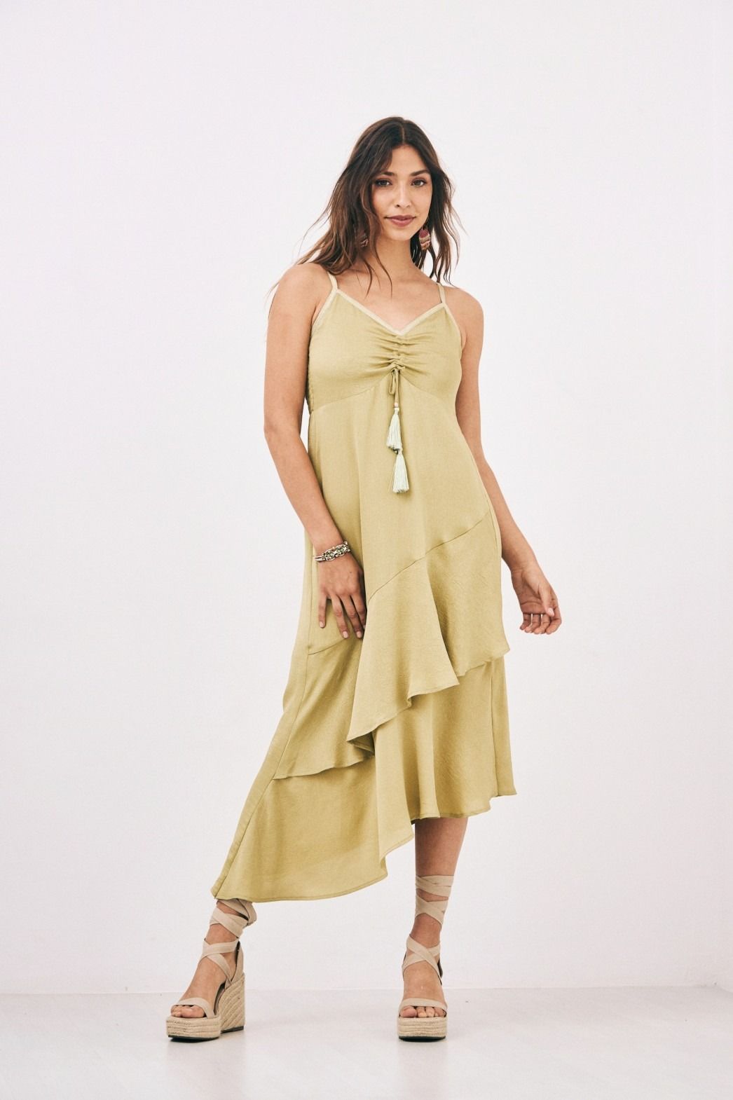 Abito lungo in tinta unita con spalline sottili e volant, orlo asimmetrico.